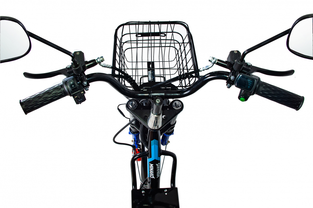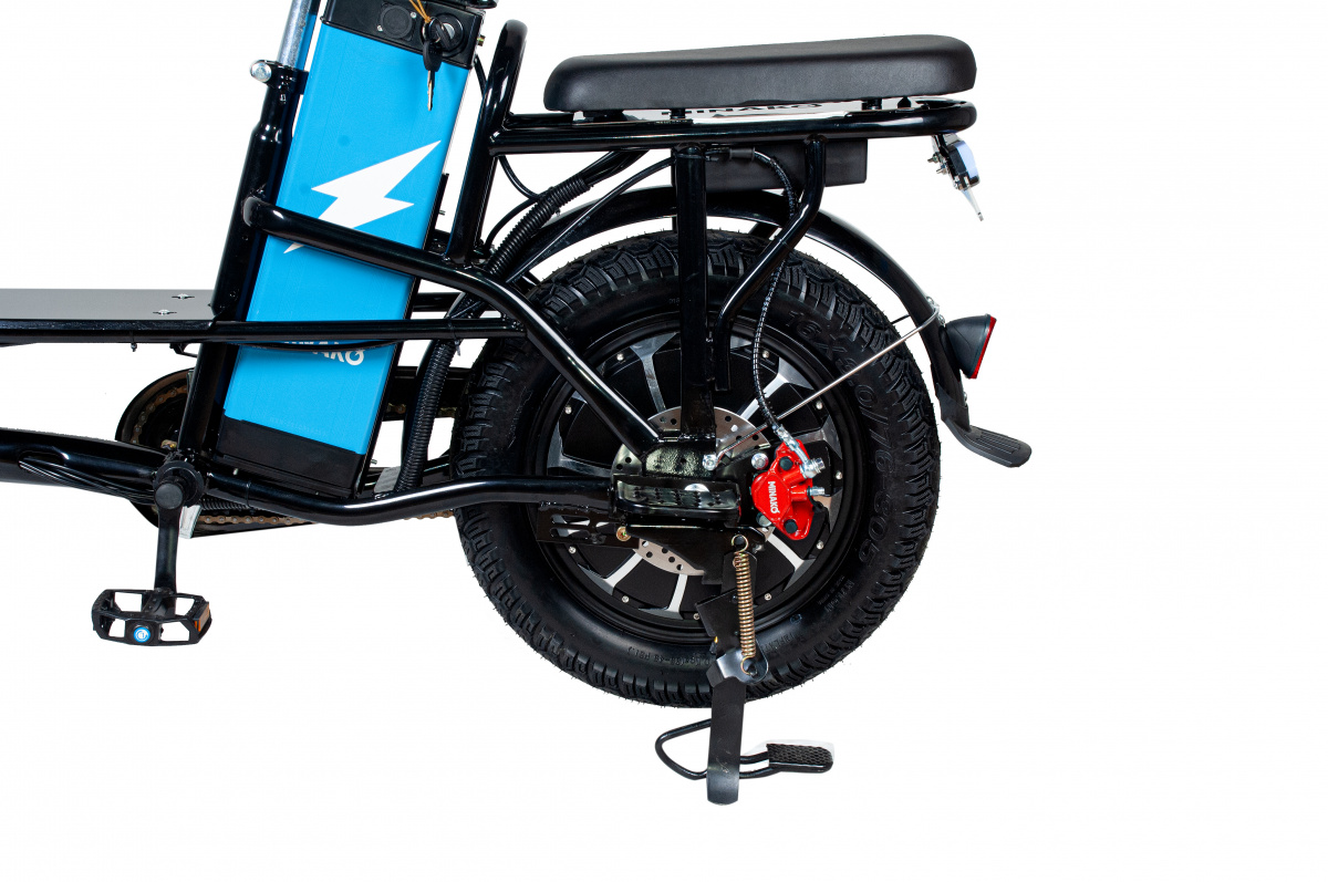 У велосипеда надёжная низкая рама, мотор мощностью в 500W, который развивает скорость до 55 км/ч., батарея, преодолевающая расстояния до 60 км.